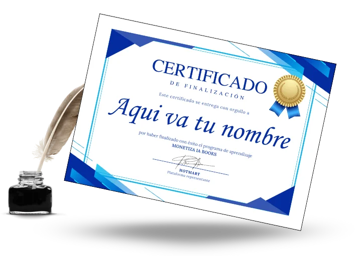 Al completar Monetiza IA Books, recibirás un certificado digital personalizado que acredita tu conocimiento en la creación y monetización de ebooks con inteligencia artificial.